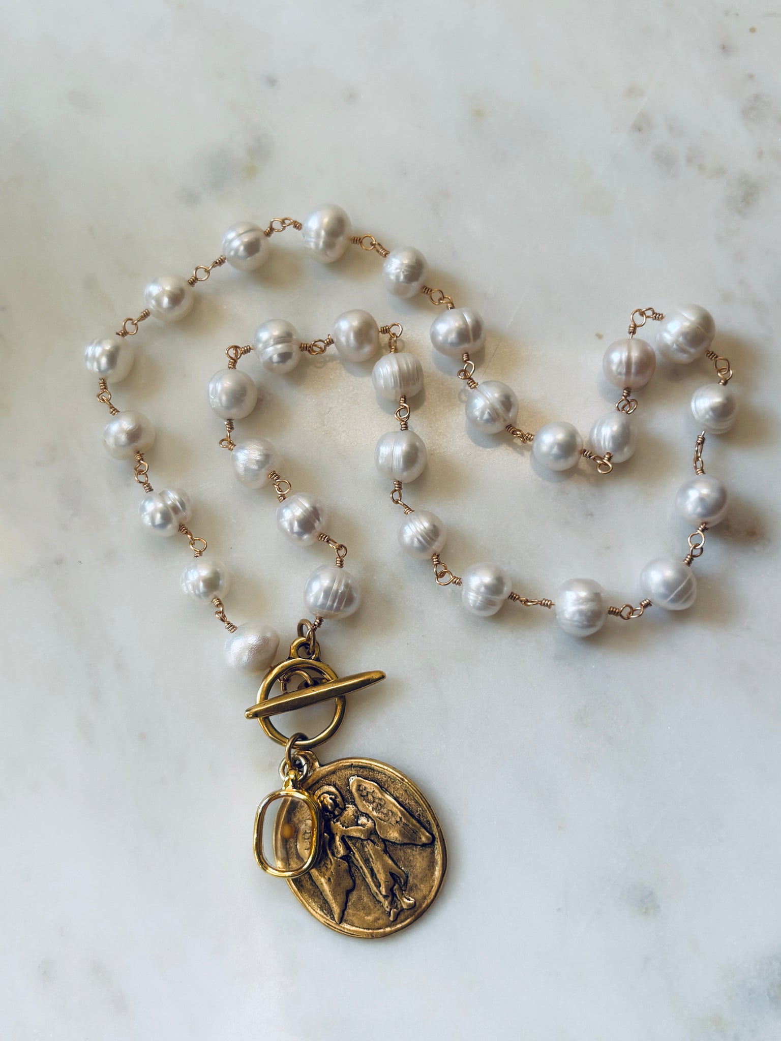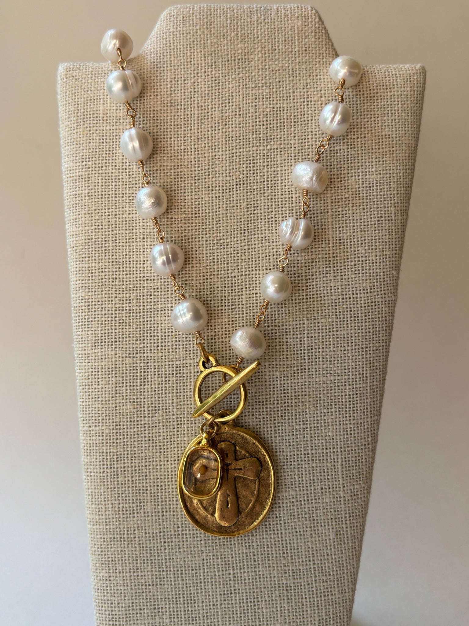 Freshwater pearl toggle necklace with dual sided charm (1) side - angel (2) cross + mustard seed charm. Available in 16 inch or 18 inch. Please indicate length preference in the notes section at check out.